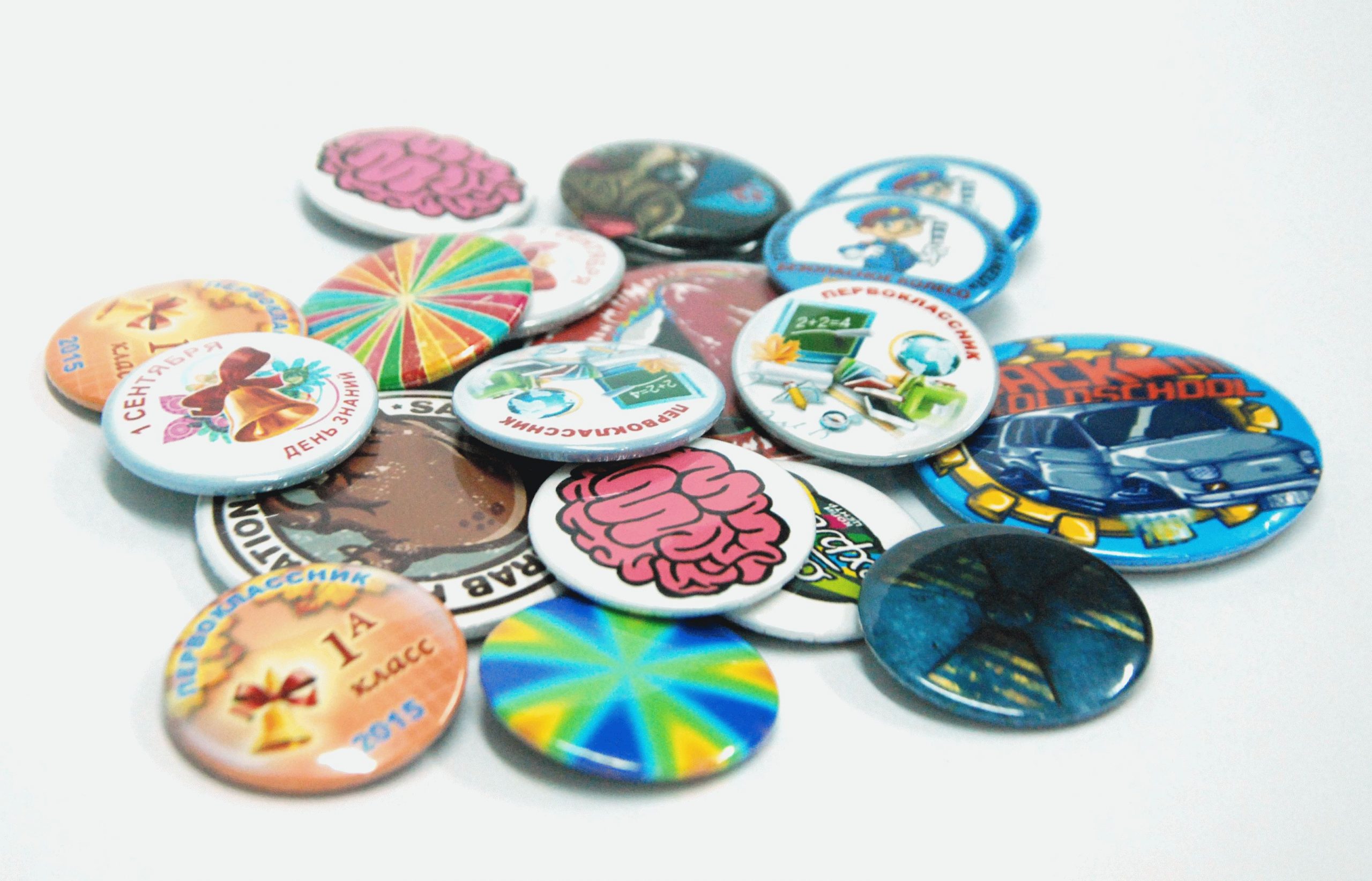Наша компания занимается изготовлением круглых закатных значков диаметром 37 мм. и 56 мм. в СПб. Чаще всего их используют на презентациях или в учебных заведениях.